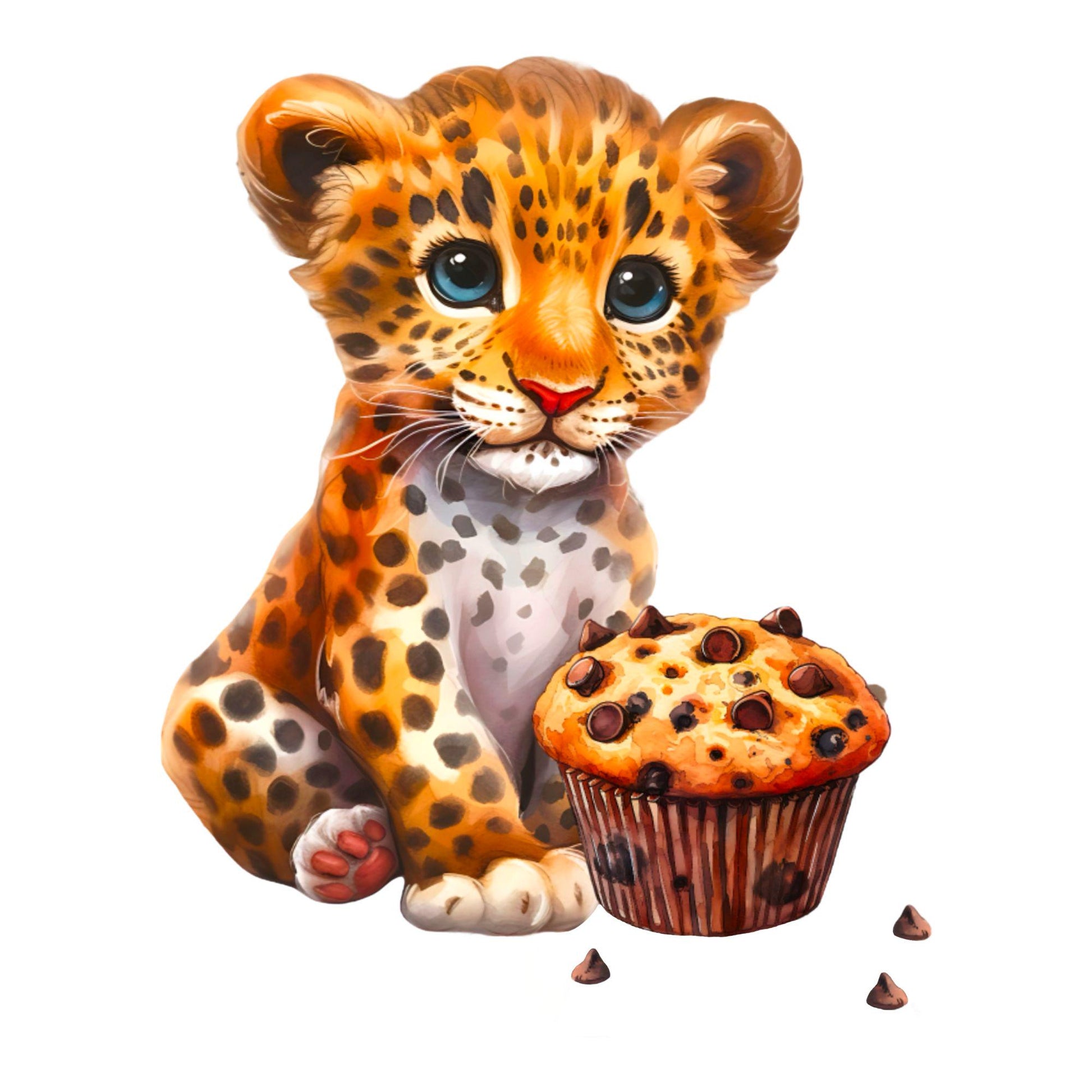 Das Bügelbild „Baby Leopard mit Schoko Muffin“ zeigt einen niedlich illustrierten Baby-Leoparden mit einem leckeren Schoko-Muffin in einem verspielten, kindgerechten Stil. Die warmen Farben und die liebevollen Details machen das Motiv zu einem süßen Blickfang auf Baby- und Kinderkleidung.