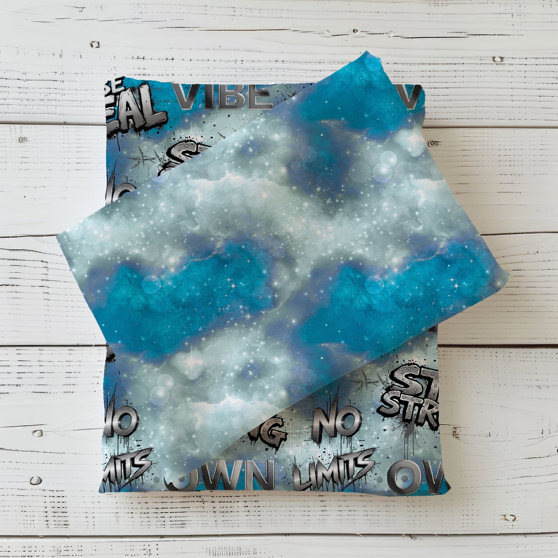Der Kombistoff „Be Real Cloud“ ergänzt das Statement-Design „Be Real“ auf besonders harmonische Weise. Sanfte Blau-, Türkis- und Grautöne treffen auf eine wolkige, leicht schimmernde Struktur mit feinen Lichtpunkten und verleihen dem Stoff eine moderne, ruhige Tiefe.