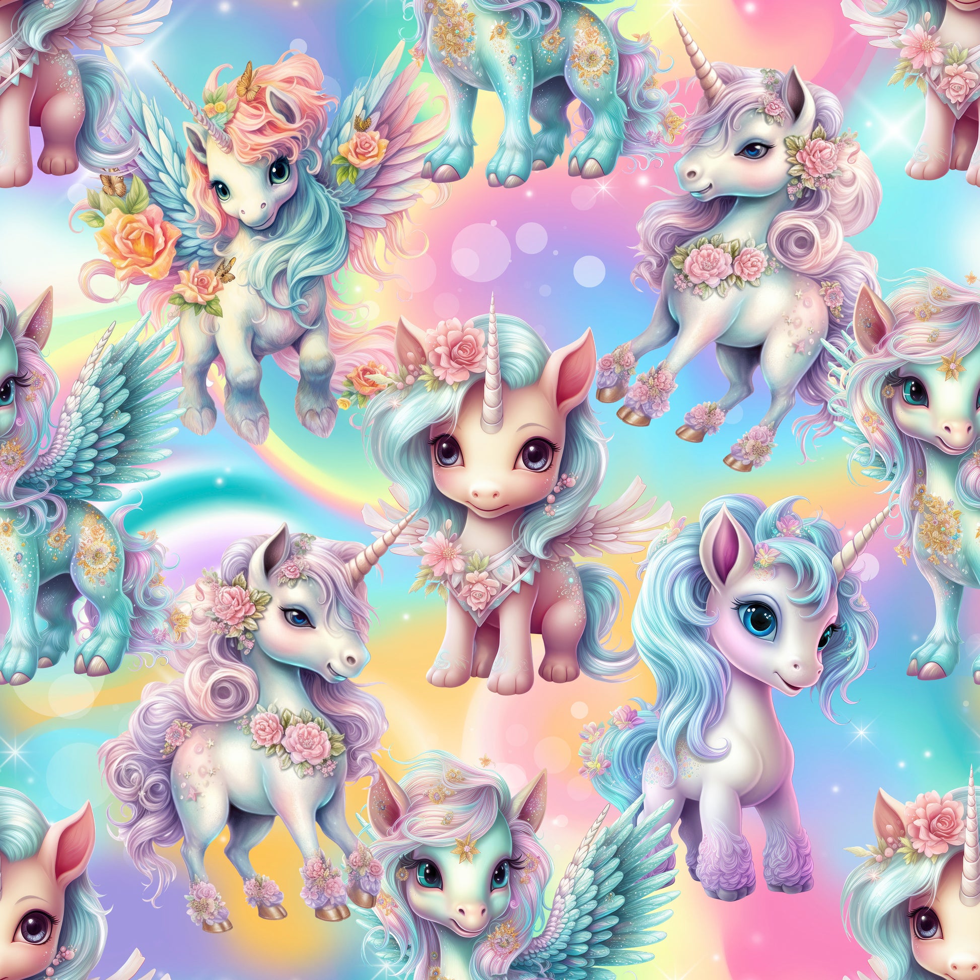 Tauche ein in eine Welt voller Magie, Glitzer und Fantasie! Unser hochwertiger Pegasus Stoff als Jersey oder French Terry macht deine Nähträume wahr. Ob für Baby- und Kinderkleidung, kreative Accessoires oder dein Handmade-Business – dieses Design bringt Freude und strahlende Regenbogenfarben in jedes Projekt.
