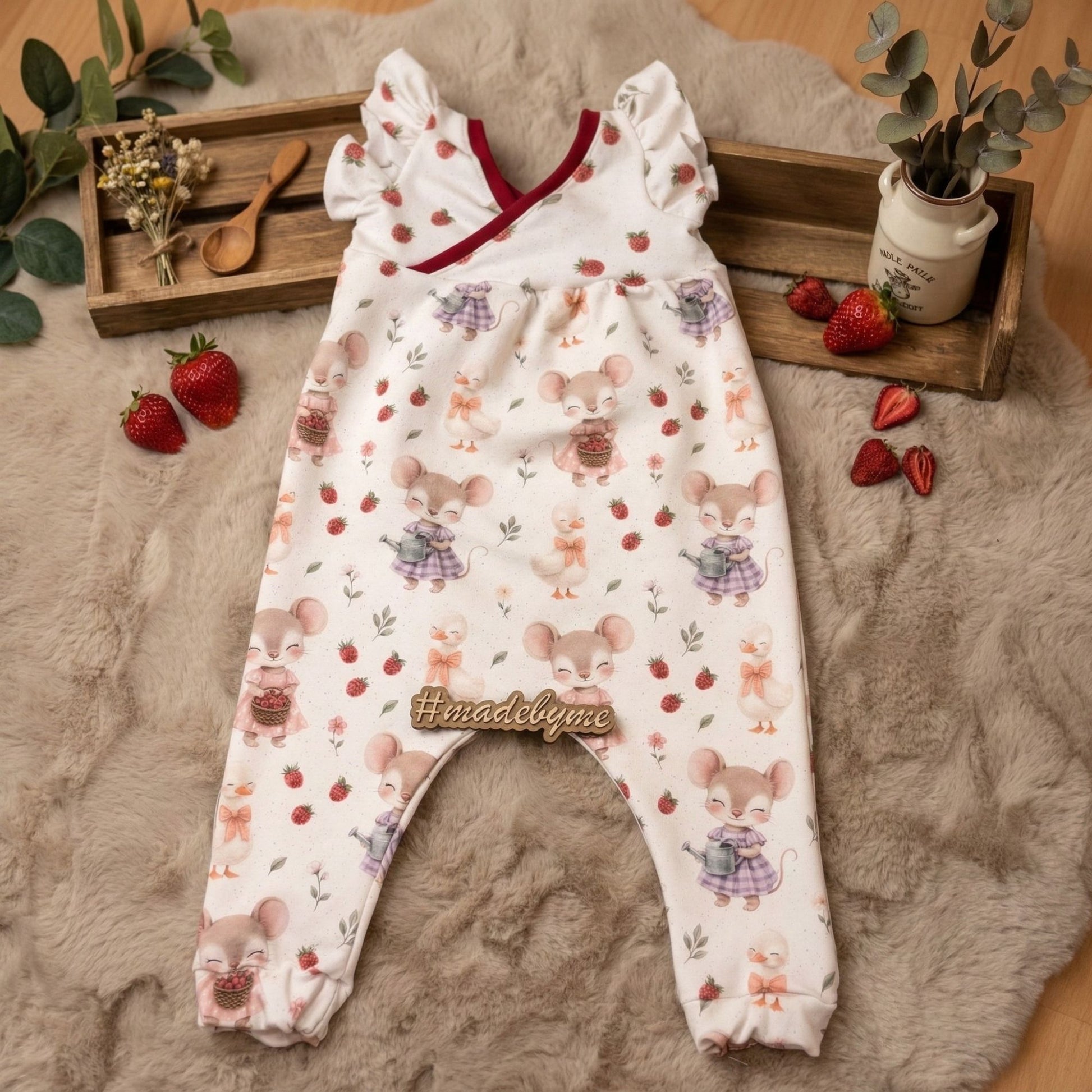 Der Stoff „Landliebe Mäuschen“ zeigt ein liebevoll gestaltetes Mausmotiv im verspielten Landhausstil. Kleine Mäuse mit Körbchen, Blumen und Erdbeeren verleihen dem Design eine freundliche und ruhige Ausstrahlung. Die zarten Natur- und Rosatöne wirken harmonisch und passen besonders gut zu liebevoll gestalteter Baby- und Kinderkleidung