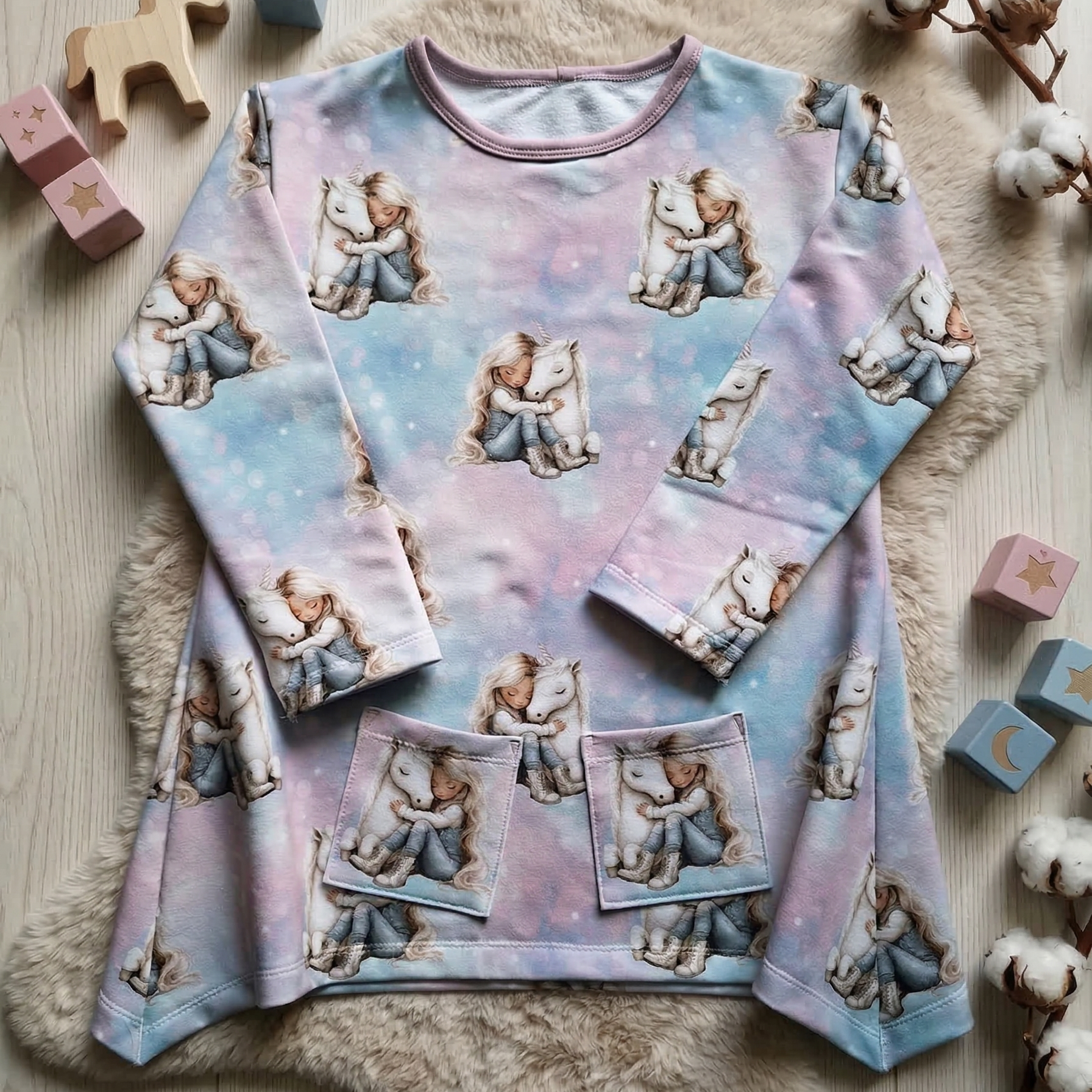 Mädchen & Einhorn – liebevolles Einhorn Stoffdesign mit verträumter Szene