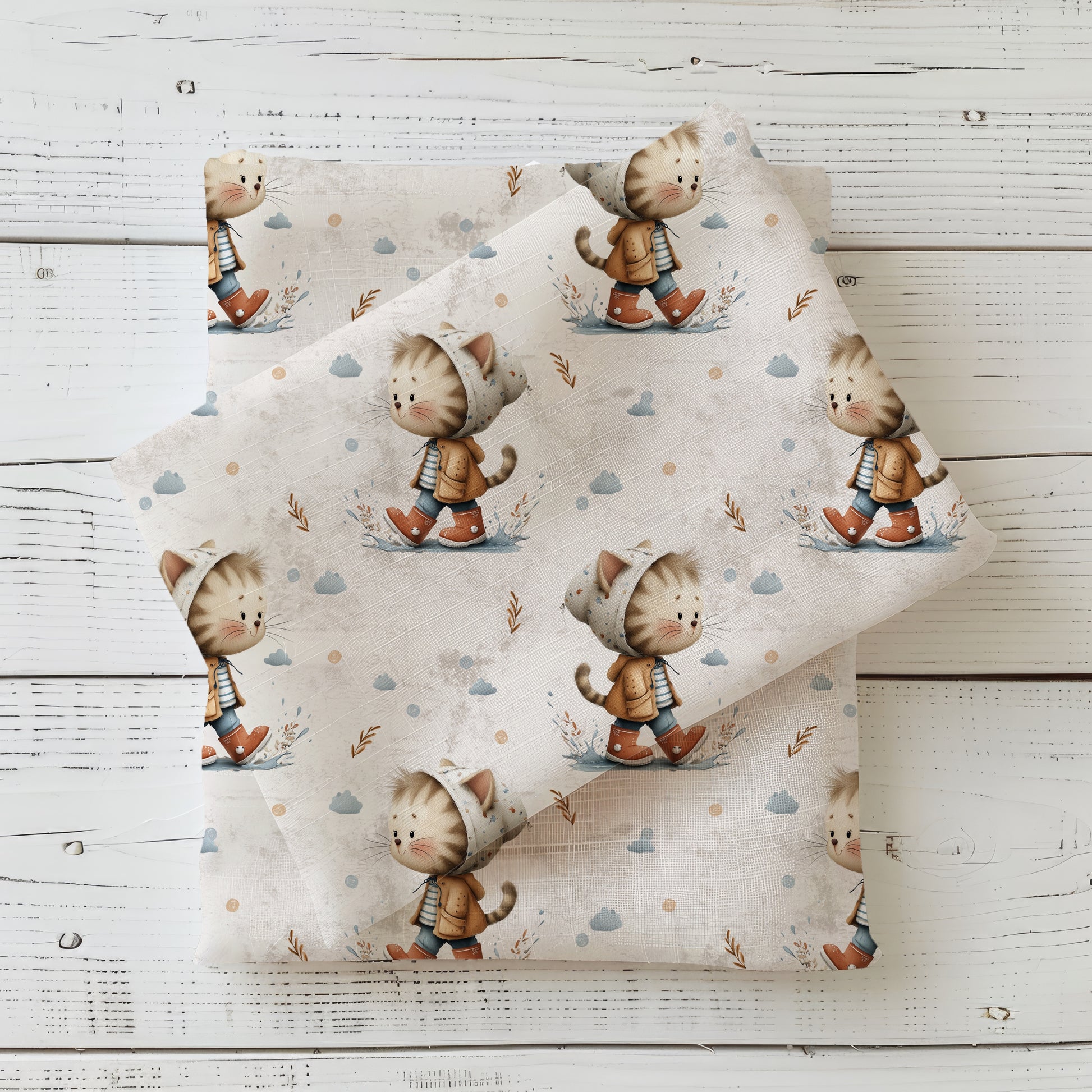 Das Stoffdesign „Matschpfötchen“ zeigt eine kleine Katze, die fröhlich durch Pfützen stapft. Mit ihren Gummistiefeln, der gemusterten Kapuze und ihrem neugierigen Blick entsteht eine liebevolle Herbstszene, die sofort Wärme und Geborgenheit ausstrahlt.
