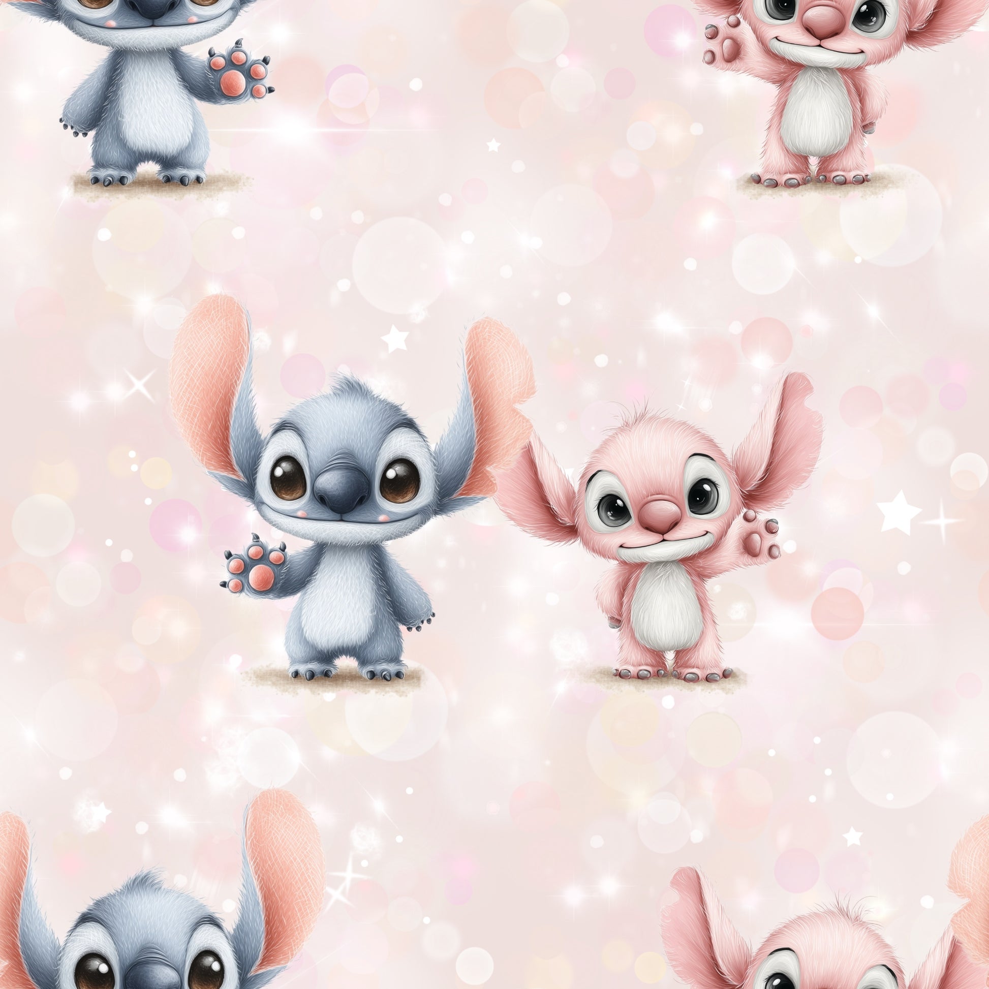 Der Hintergrund in sanften Rosé- und Pastelltönen wird durch leichte Bokeh-Lichteffekte, kleine Sterne und dezente Farbpunkte ergänzt. Dadurch wirkt das Design warm, ruhig und gleichzeitig lebendig. Die Kombination aus niedlichen Figuren und der weichen Farbwelt macht das Motiv besonders freundlich und emotional.