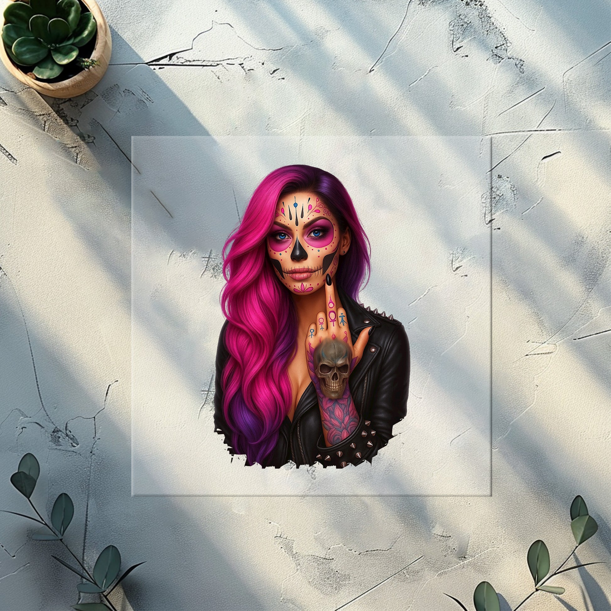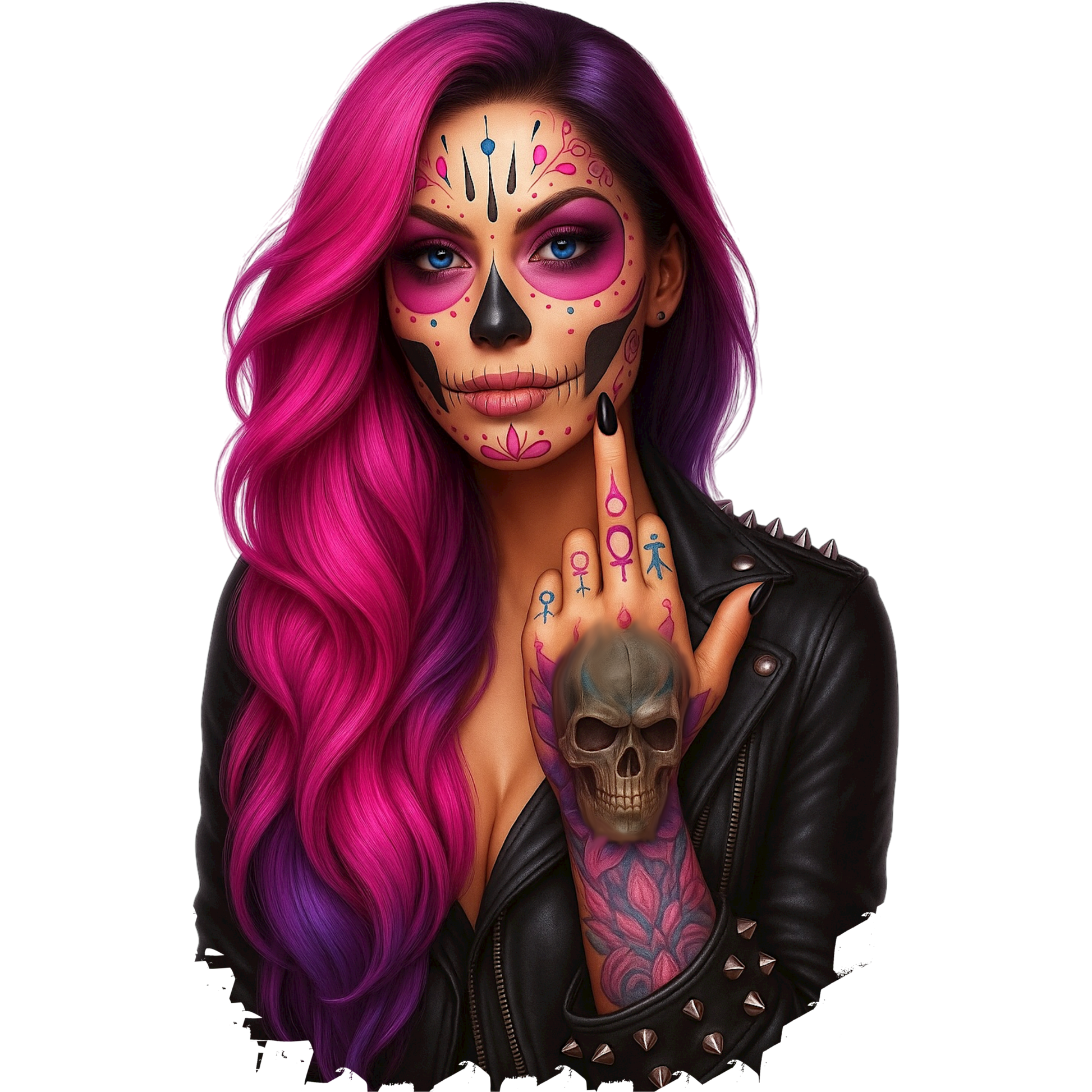 Unser DTF-Bügelbild „Viva La Rebel – Pink Skull Girl“ kombiniert intensives Pink-Purple-Hair mit hochwertiger Sugar-Skull-Art, Lederjacke, Tattoos und einem selbstbewussten Rock-Look. Ab sofort auch in Glitzer erhältlich, perfekt für alle, die ein Fashion-Statement setzen möchten, das im Licht schimmert wie ein echtes Highlight.