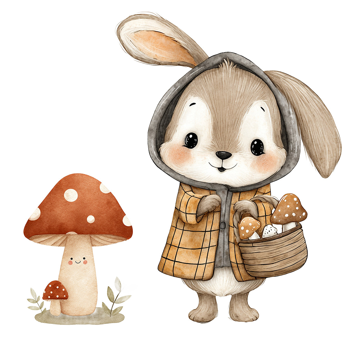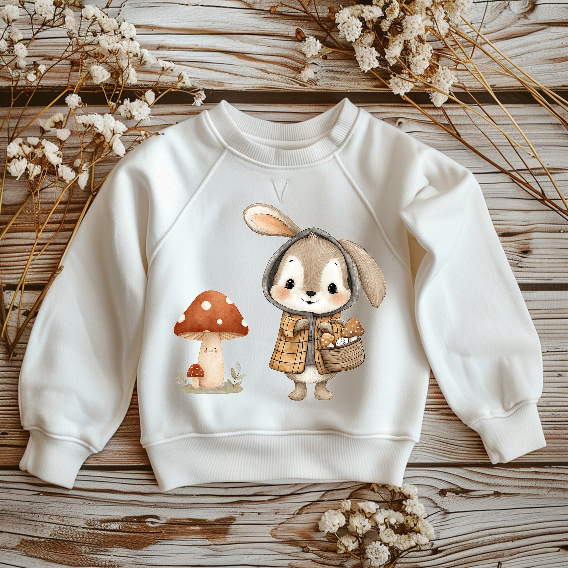 Bügelbild für helle & dunkle Textilien – Hase der Pilze sammelt