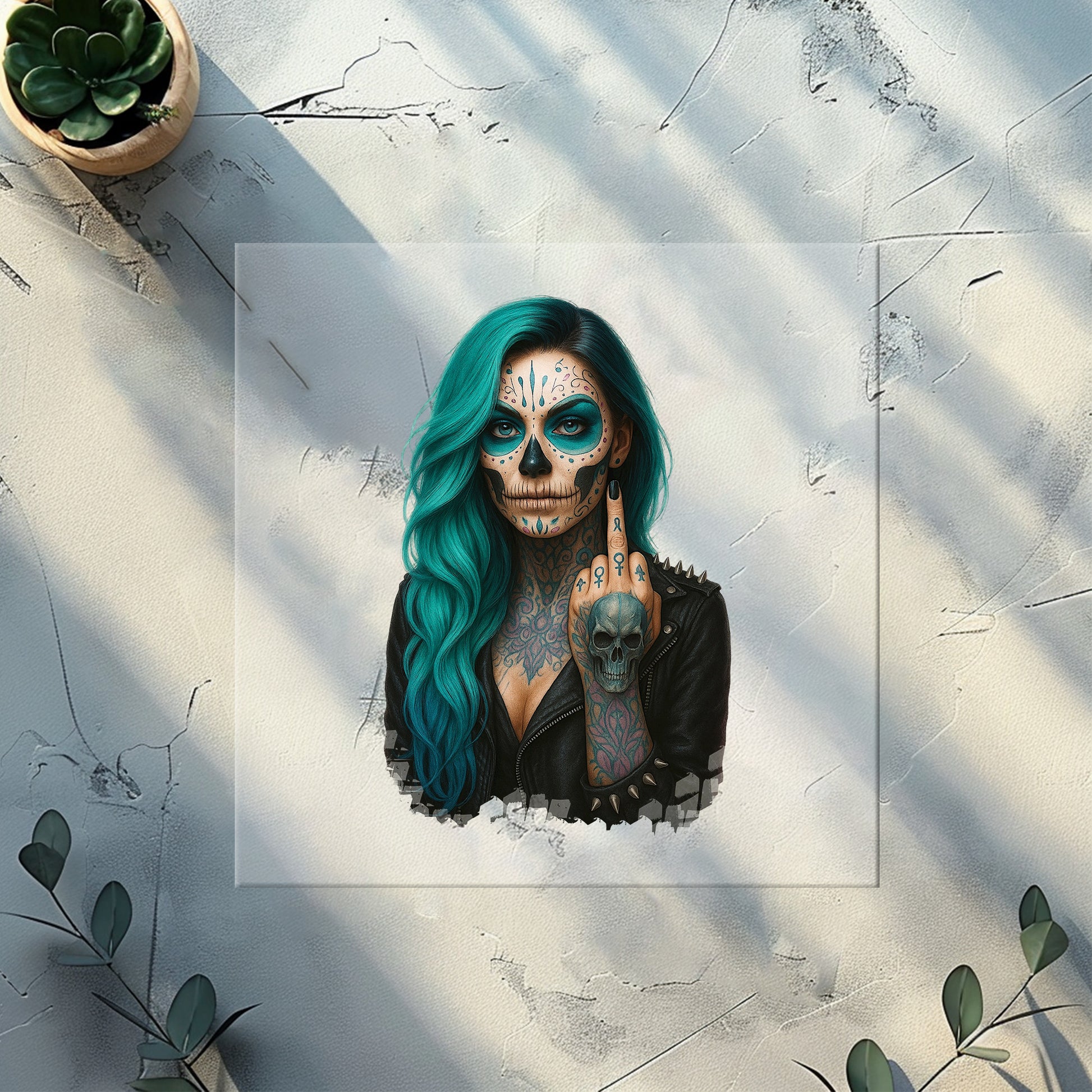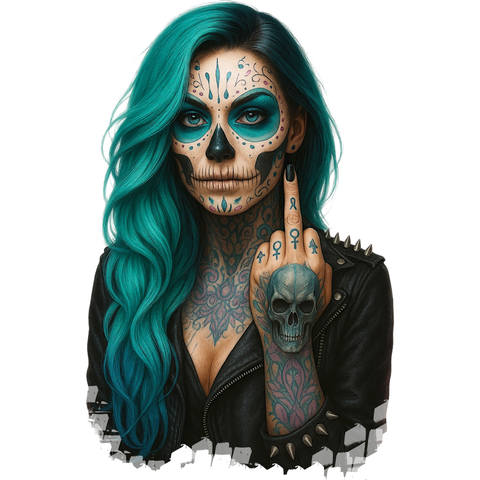 Das „Viva La Rebel – Teal Skull Girl“ zeigt eine selbstbewusste Skull-Beauty mit kräftigem Petrol-Türkis Haar, detaillierter Sugar-Skull-Face-Art, Tattoos und einer rockigen Lederjacke mit Nieten. Markant, edgy und perfekt für alle, die Kleidung mit Message tragen.