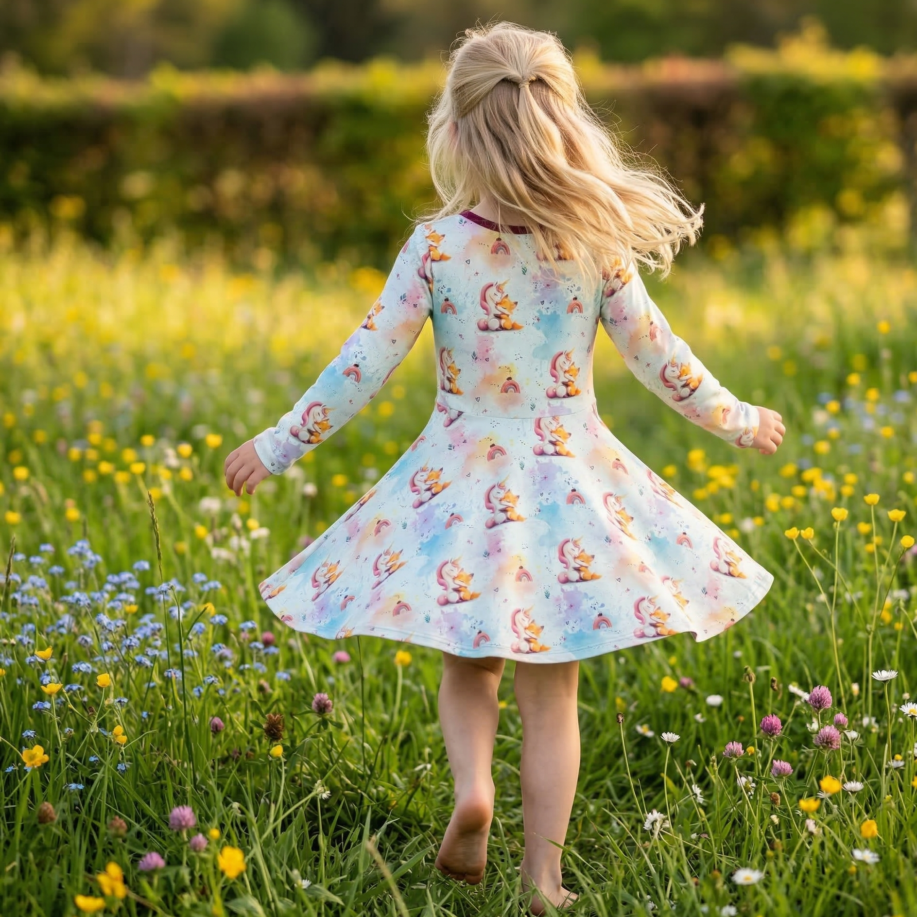 Das Stoffdesign „Einhorn & Fuchs“ zeigt eine zauberhafte Szene: Ein Einhorn umarmt einen kleinen Fuchs. Umgeben von zarten Regenbögen, Blüten und sanften Aquarellakzenten entsteht eine verträumte und harmonische Illustration.