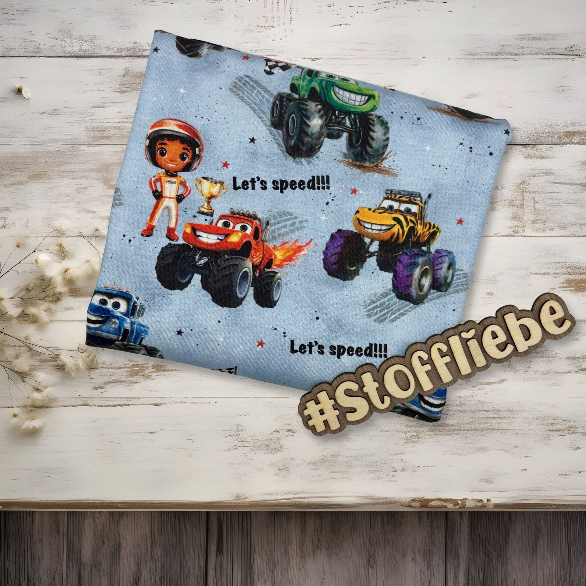🏁 Stoff „Monster Truck“ – 0,5m French Terry in Blau, sofort verfügbar