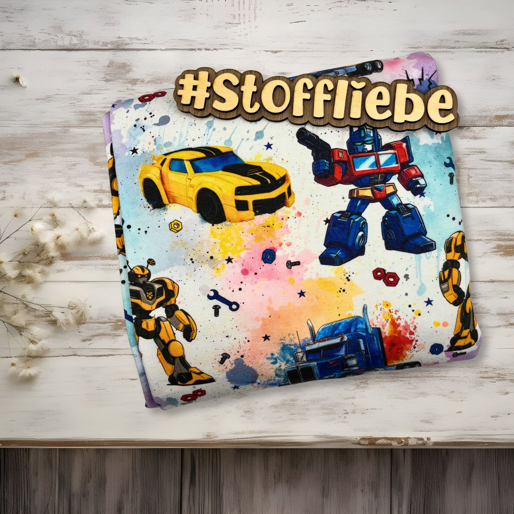 Unser French Terry „Transformers Style“ bringt Action an die Nähmaschine! Das Design mit kleinen Robotern, bunten Farbklecksen und Fahrzeugen sorgt für echte Begeisterung – perfekt für Jungs und kleine Held:innen, die es farbenfroh und cool lieben.
