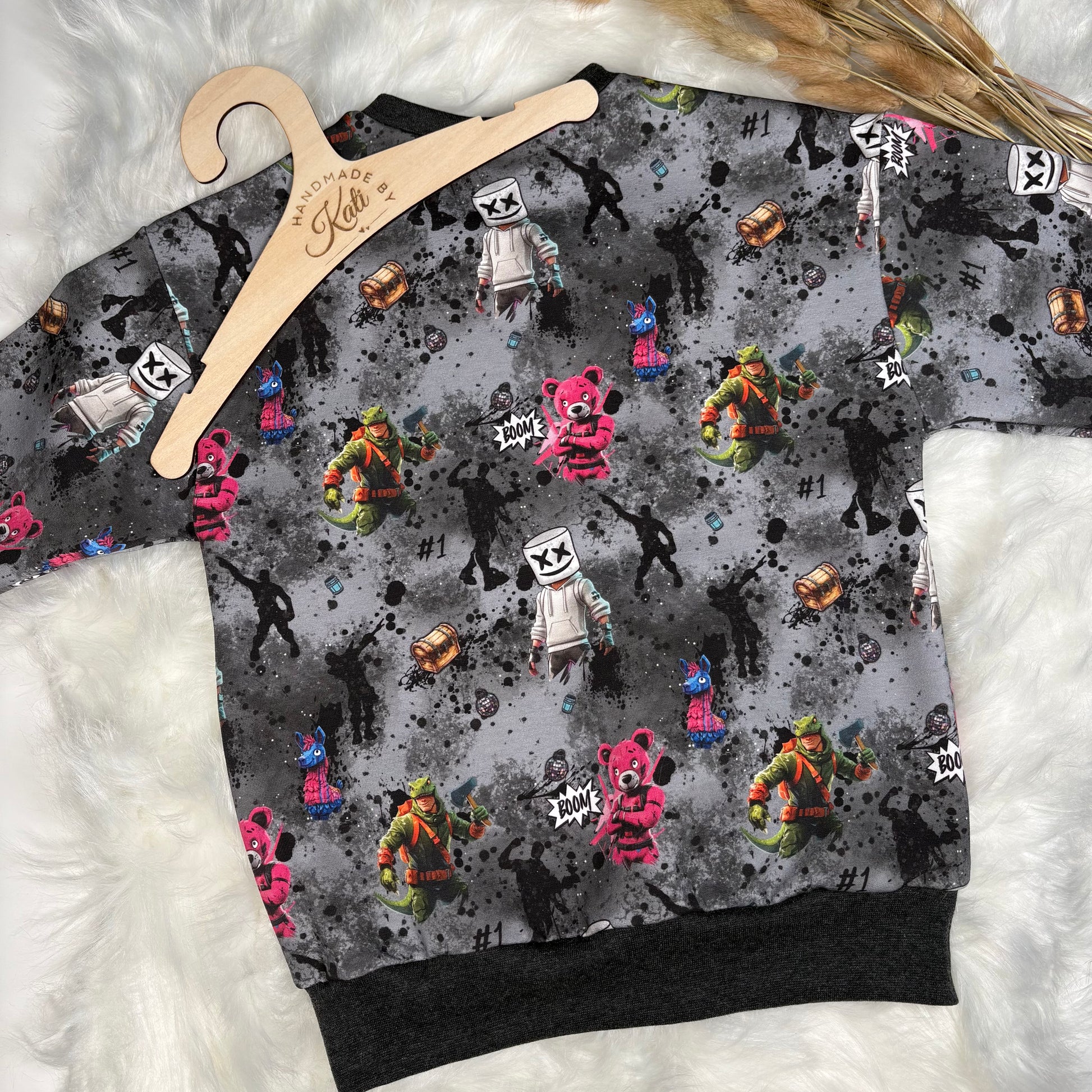 Das Stoffdesign „Game 4 Nite“ bringt echten Gaming-Style auf Stoff. Coole Charaktere, Emotes, Schatztruhen und dynamische „Boom“-Effekte sorgen für ein lebendiges, actiongeladenes Gesamtbild, das sofort ins Auge fällt.
