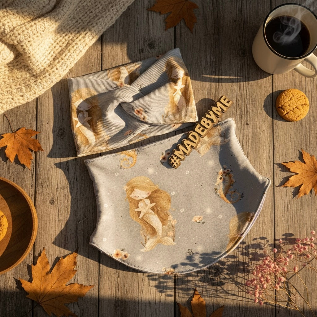 Unser liebevoll genähtes Set „Meerjungfrauentraum“ bringt zauberhafte Meeresstimmung in den Alltag. Das Motiv zeigt eine verträumte Meerjungfrau umgeben von Seepferdchen und kleinen Blüten – perfekt für kleine Mädchen, die das Besondere lieben.