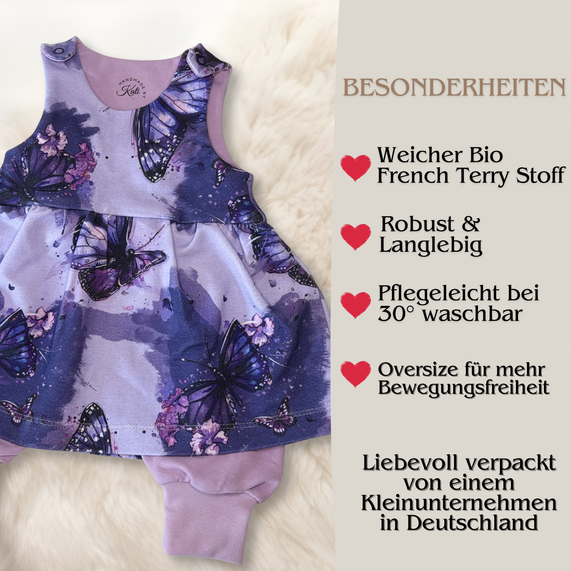 Stell dir vor, wie dein Baby an einem warmen Frühlingstag über die Wiese tapselt – barfuß, mit Sonnenhut auf dem Kopf und Schmetterlingen auf dem Stoff. Genau dieses Gefühl haben wir in dieses Design gepackt: Natürlichkeit, Leichtigkeit und ganz viel Liebe.