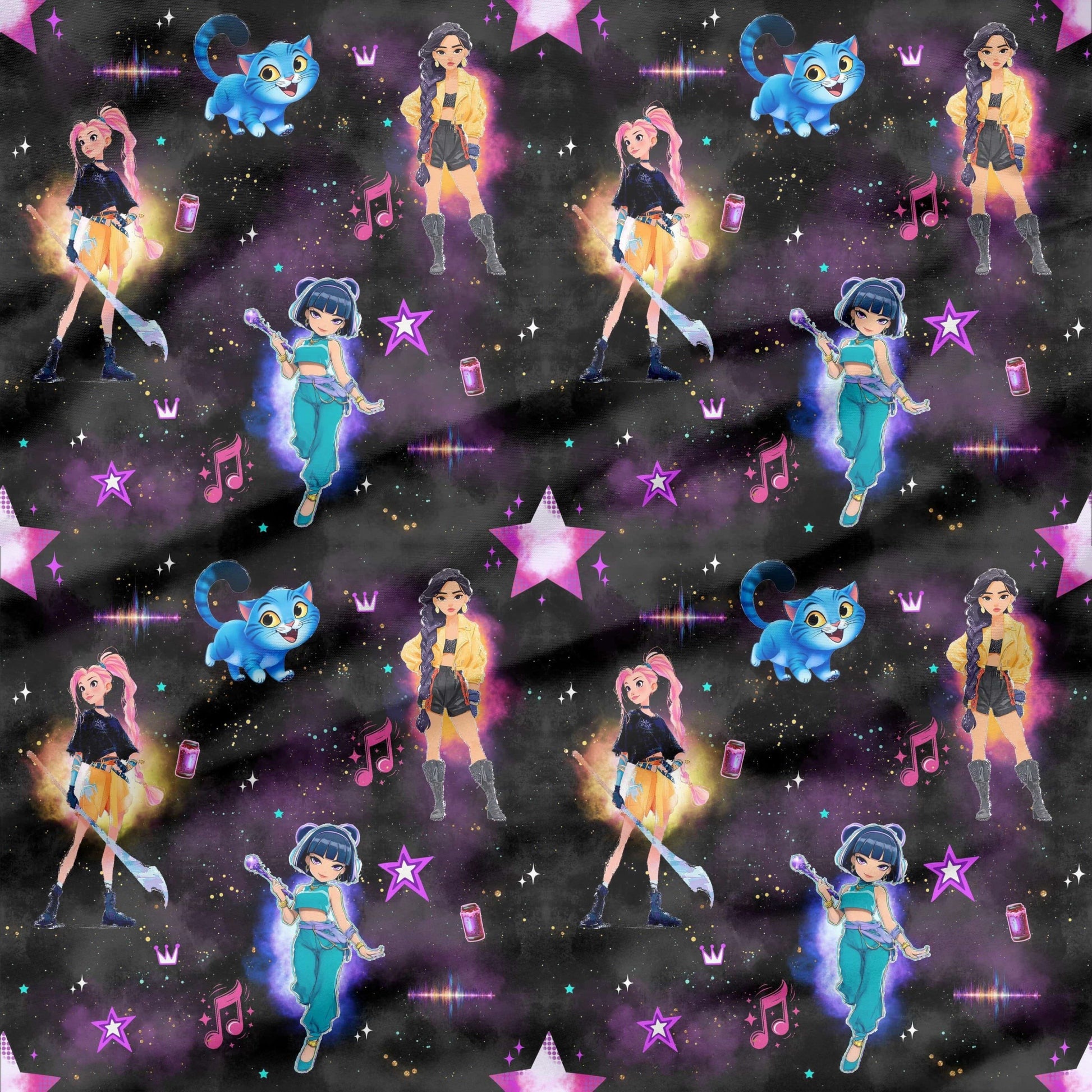 Mit dem „Magic Girls“ Stoffdesign zieht magische Energie in dein Nähzimmer ein. Leuchtende Farben, coole Mädchencharaktere, eine verspielte Katze und funkelnde Neon-Details machen diesen Stoff zu einem echten Statement-Piece!