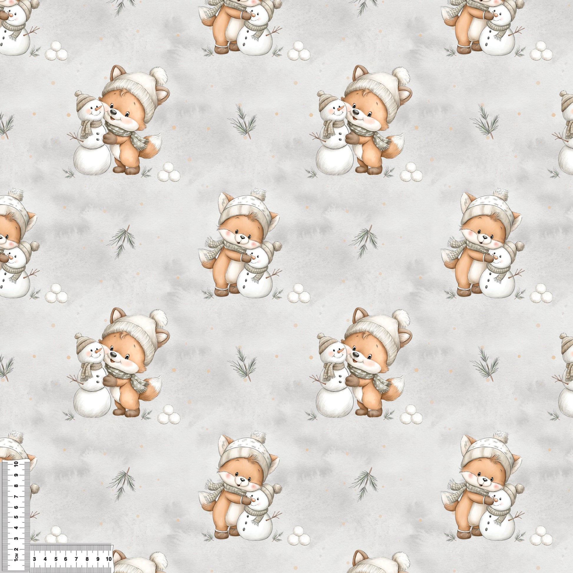 Dieses liebevoll gestaltete Stoffdesign zeigt einen niedlichen Fuchs mit Strickmütze und Schal, der einen Schneemann umarmt. Kleine Schneebälle, Tannenzweige und zarte Punkte runden das winterliche Motiv auf hellgrauem Hintergrund perfekt ab.