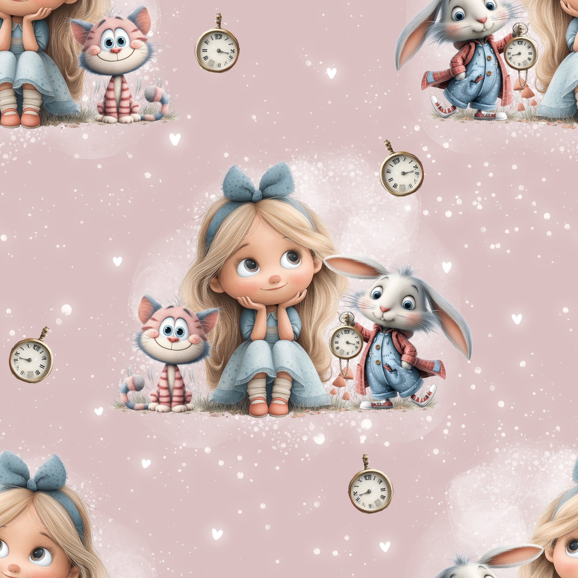 Das liebevoll gestaltete Design zeigt ein kleines Mädchen mit Schleife, ihren flauschigen Hasenfreund und die berühmte Grinsekatze – umgeben von sanften Pastelltönen und zarten Uhren-Details. 🕰️💖