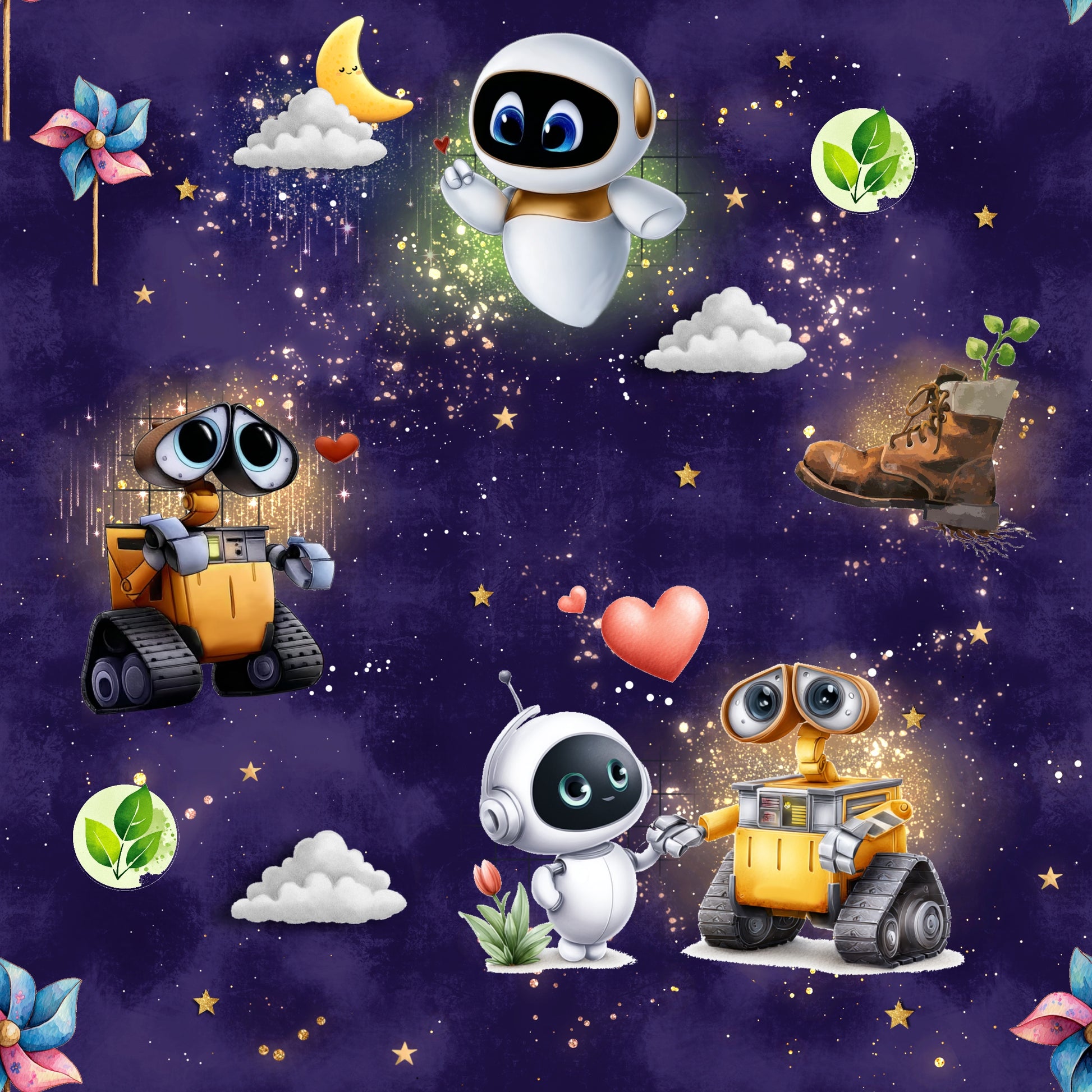 Das traumhafte Design zeigt zwei kleine Roboter, die sich unter funkelnden Sternen begegnen – mit schwebenden Herzen, leuchtenden Wolken und einem Hauch Galaxie. Der tiefe Blauton verleiht dem Stoff eine ruhige, nächtliche Stimmung, die perfekt zu den liebevollen Details passt.