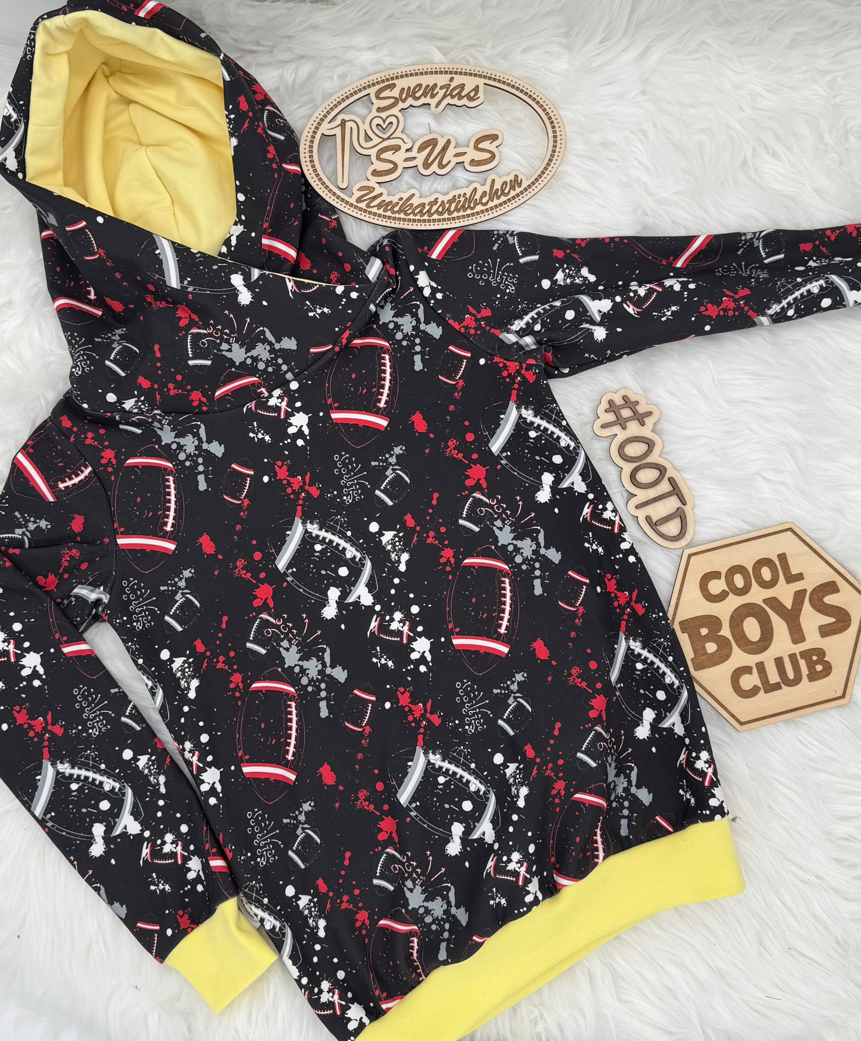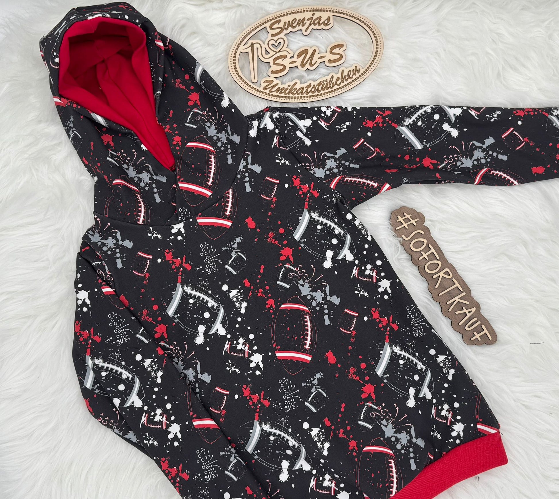 Sportlich, dynamisch und voller Energie: Das Stoffdesign „Touchdown Style“ kombiniert kraftvolle Football-Motive mit actionreichen Farbspritzern und grafischen Spielelementen auf tiefschwarzem Hintergrund. Die roten, weißen und grauen Akzente sorgen für starke Kontraste und verleihen jedem Nähprojekt einen coolen Stadion-Look.