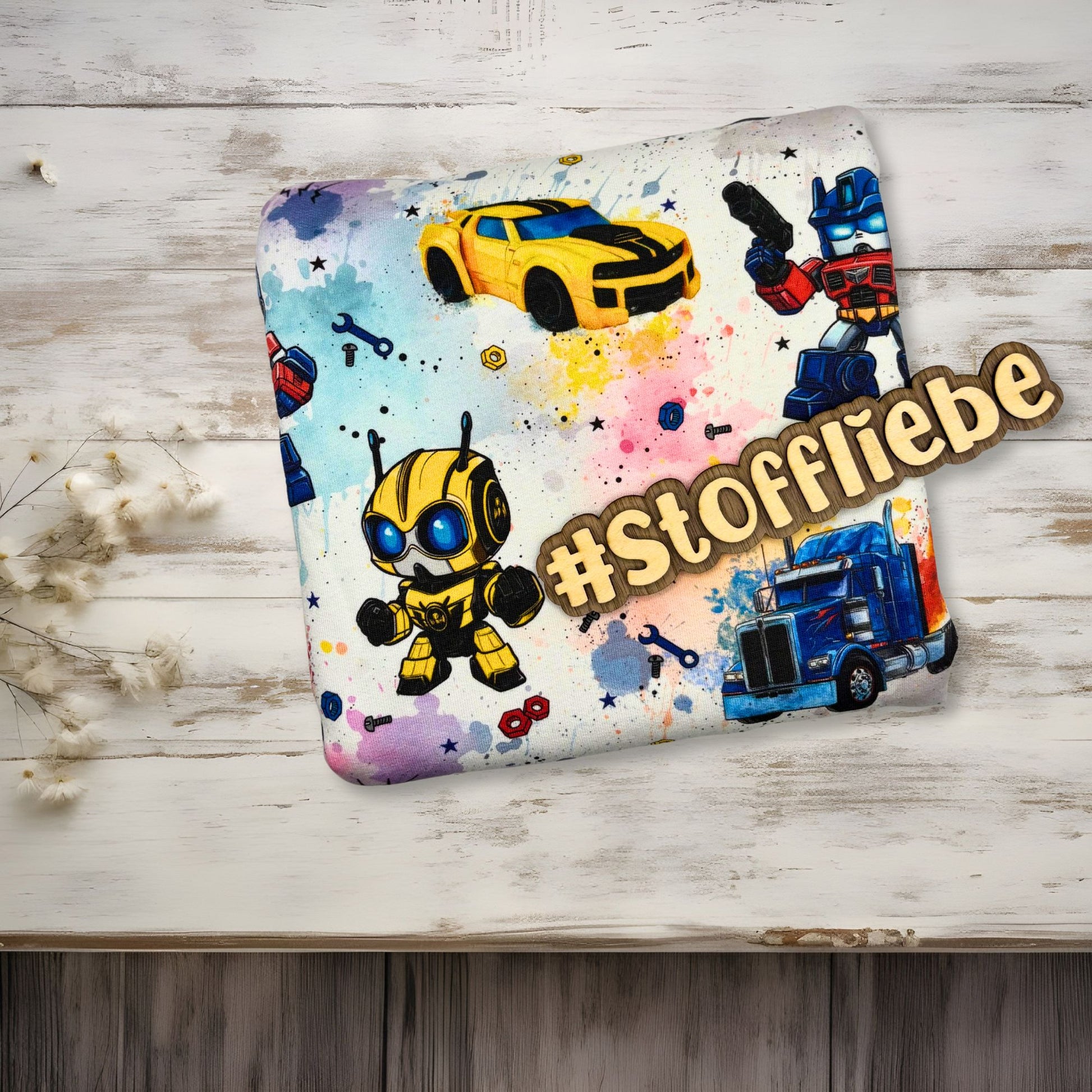 Unser French Terry „Transformers Style“ bringt Action an die Nähmaschine! Das Design mit kleinen Robotern, bunten Farbklecksen und Fahrzeugen sorgt für echte Begeisterung – perfekt für Jungs und kleine Held:innen, die es farbenfroh und cool lieben.