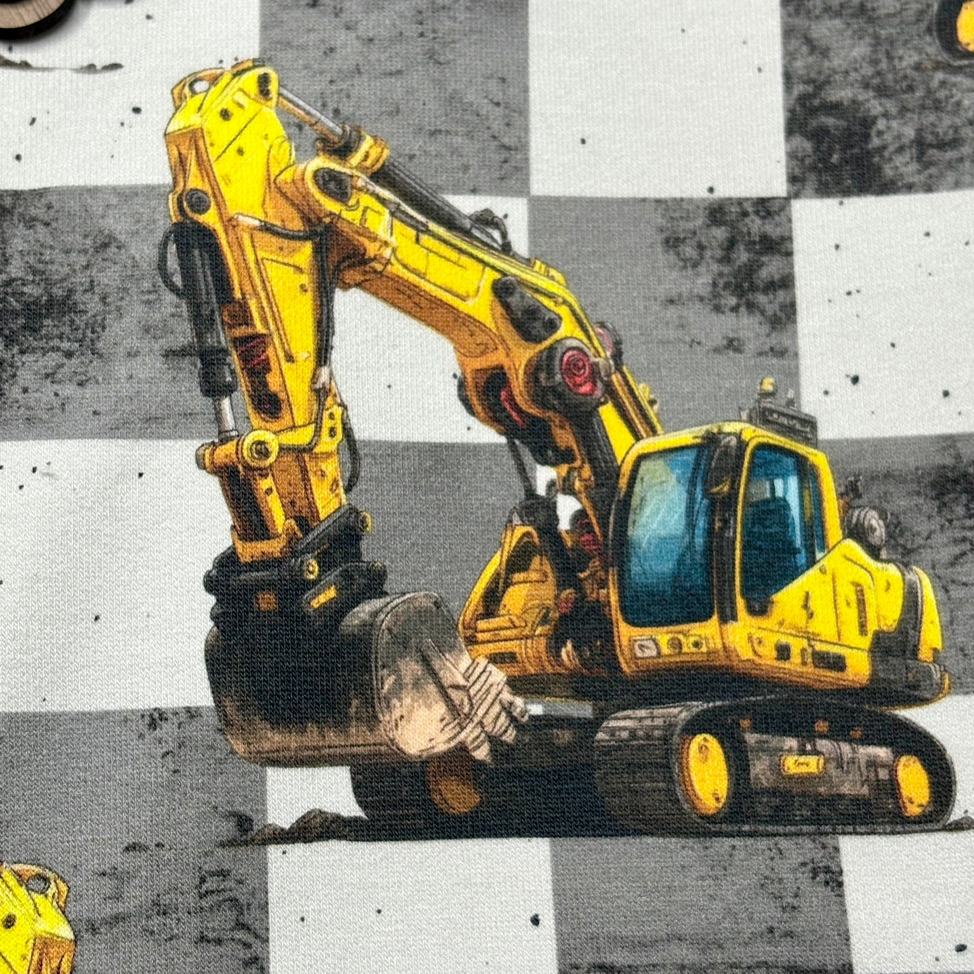 🚧 Auffälliges Bagger-Motiv mit grauem Karomuster