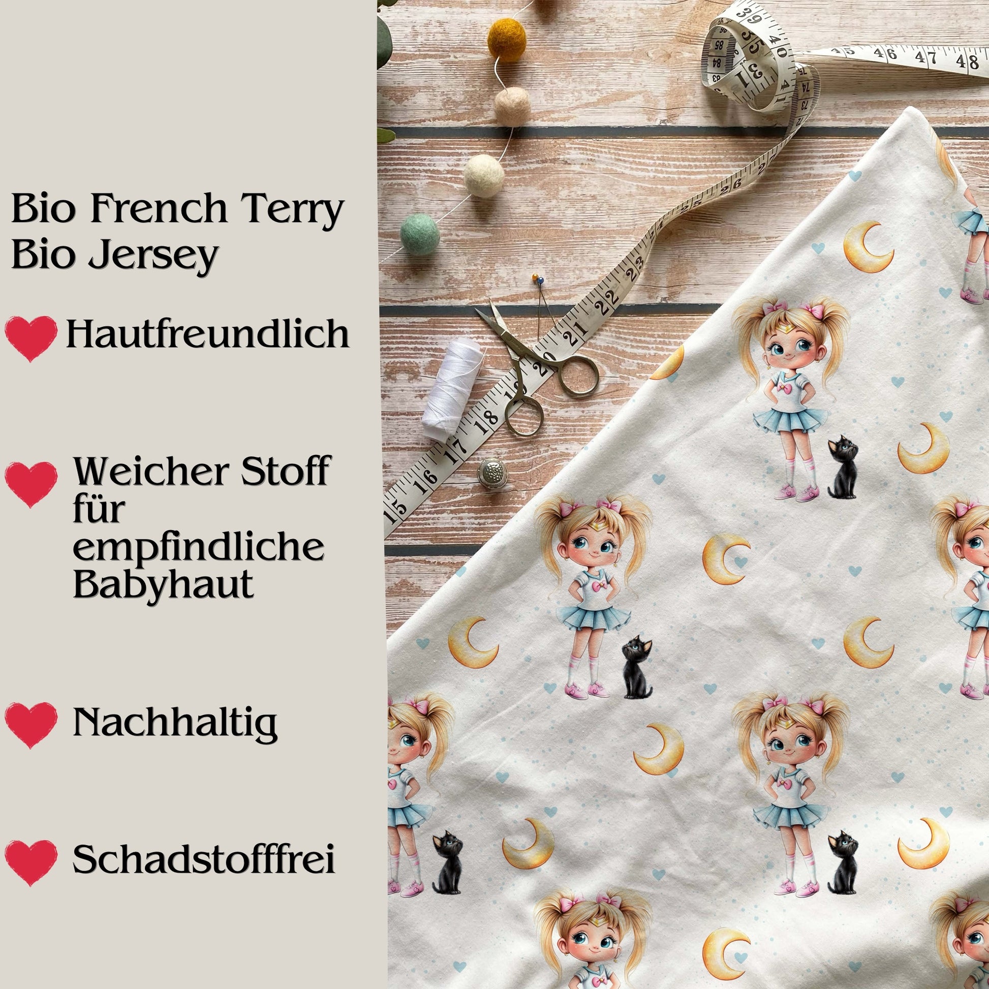 Dieser hochwertige Baumwollstoff begeistert mit einem niedlichen Design: Ein blondes Mädchen mit rosa Schleifen trifft auf einen kleinen schwarzen Kater, begleitet von goldgelben Monden und zarten Herzchen auf weißem Hintergrund. Die liebevoll illustrierten Motive machen diesen Stoff zur idealen Wahl für Kinderbekleidung, Accessoires, Kissenhüllen oder kreative Nähprojekte fürs Kinderzimmer.