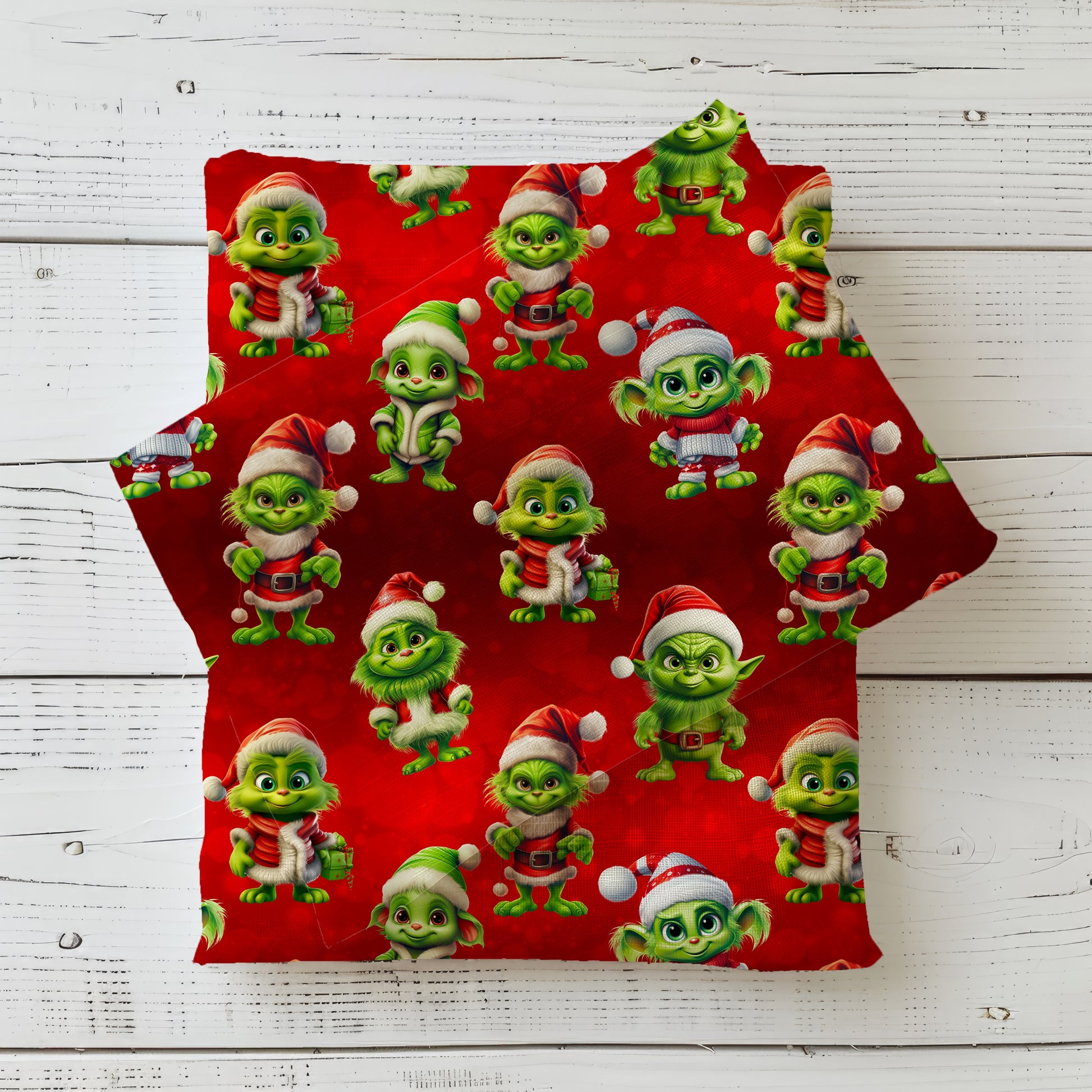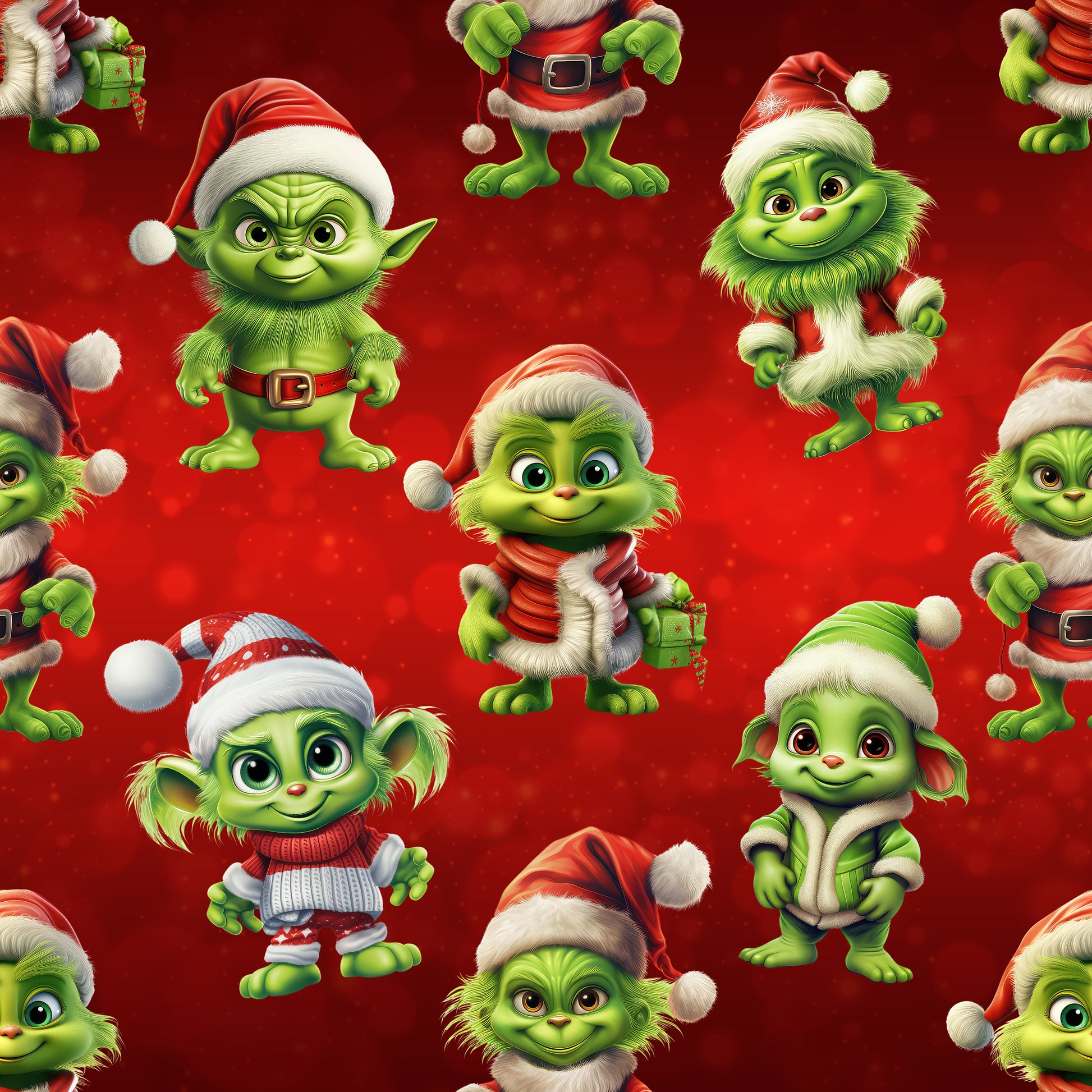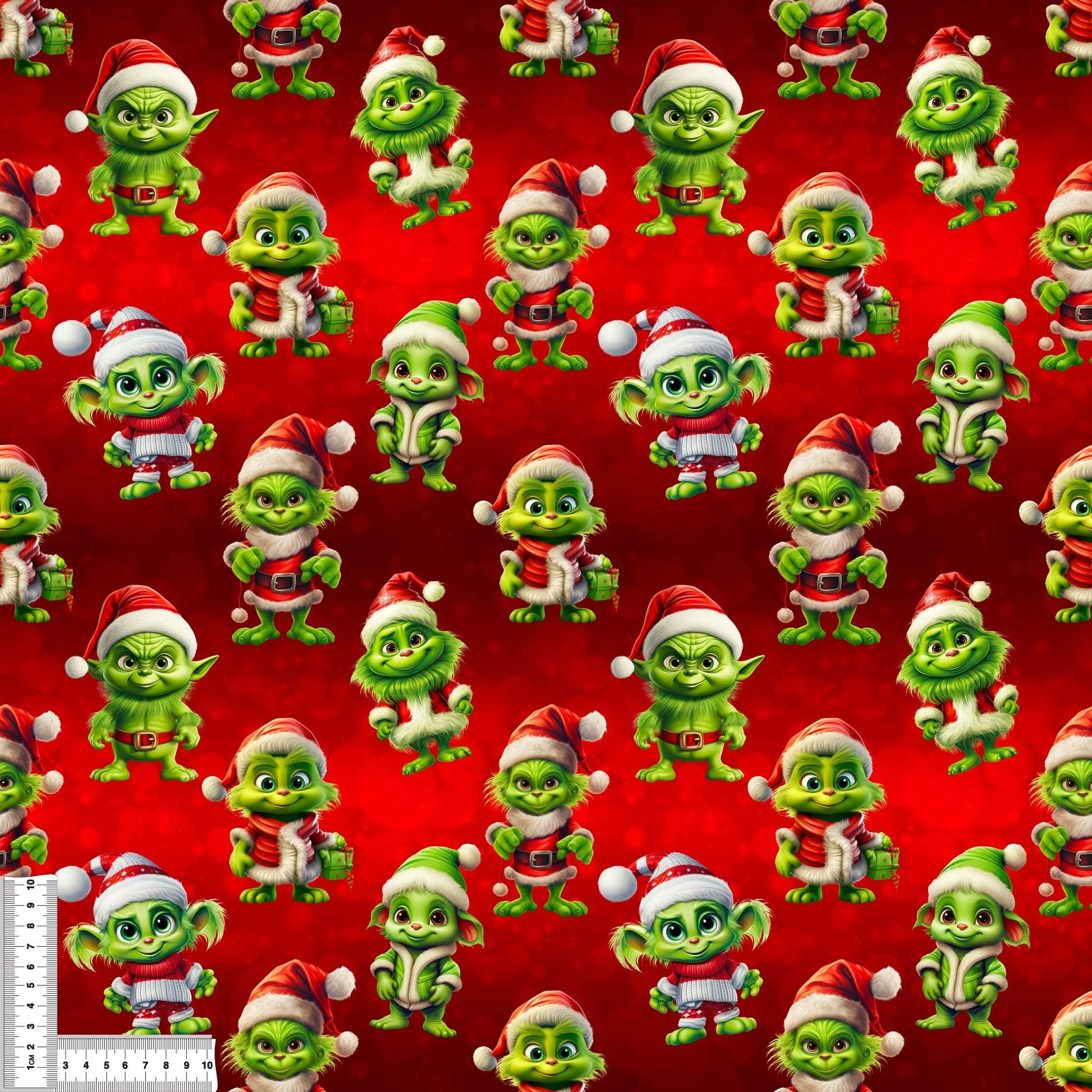 Das knallige Weihnachtsdesign zeigt süße, grüne Weihnachtsfiguren mit Wichtel-Charme, alle gekleidet in roten Mützen, warmen Jacken und festlichen Outfits. Der leuchtend rote Hintergrund macht den Stoff zum perfekten Highlight für deine Winter- und Weihnachtsprojekte.
