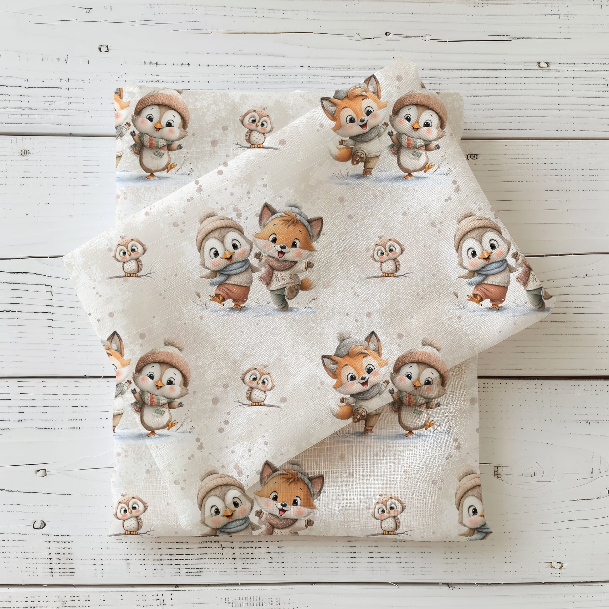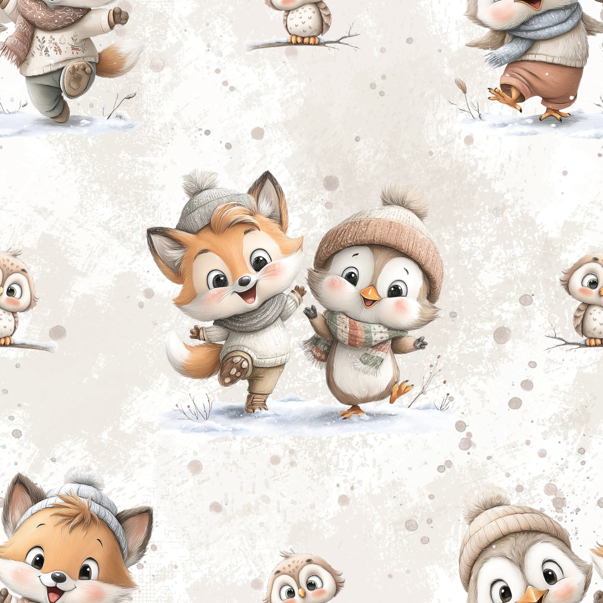 Dieses niedliche Design zeigt einen fröhlichen Fuchs und einen kleinen Pinguin, die gemeinsam im Schnee spielen. Umgeben von süßen Eulen in Mützen und Schals entsteht ein harmonisches Wintermotiv auf hellbeigem Hintergrund.